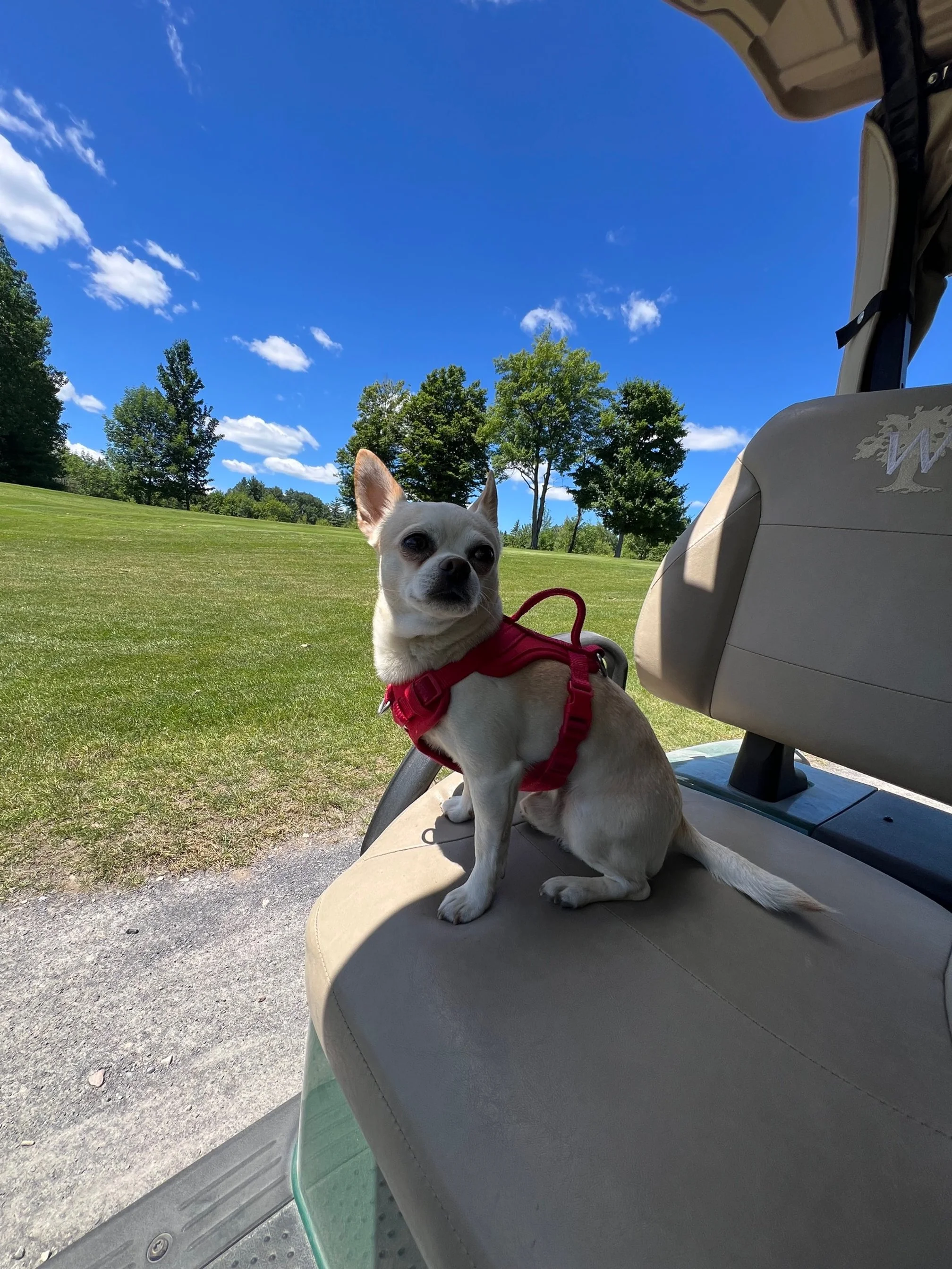 Golf course with clear blue sky and bright sun, golf cart in the distance, and a picnic table on the grass.